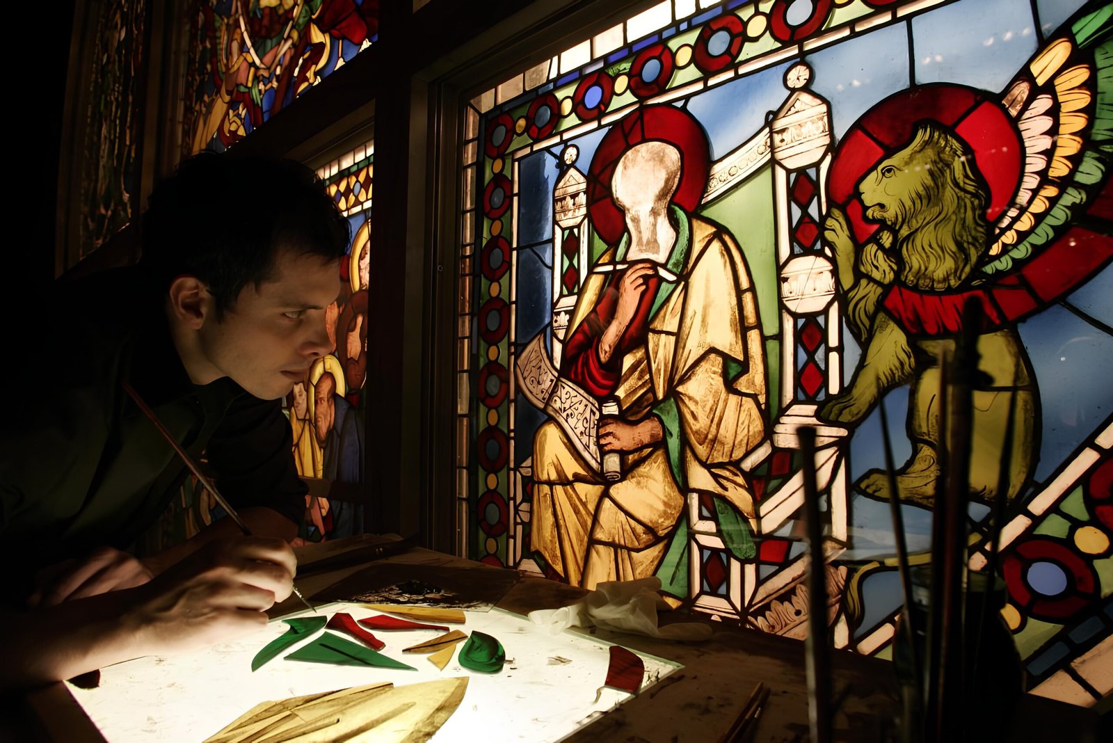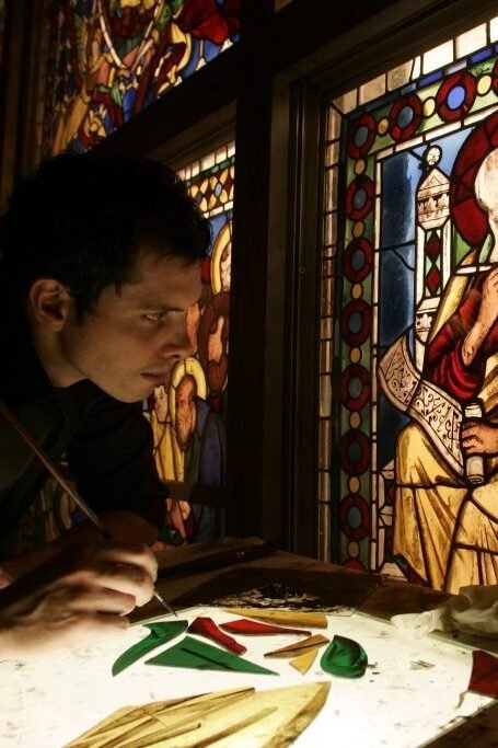 “Opere monumentali in cui la luce esalta cromie vibranti e figure sacre, realizzate recuperando con maestria le antiche tecniche della tradizione vetraria.”