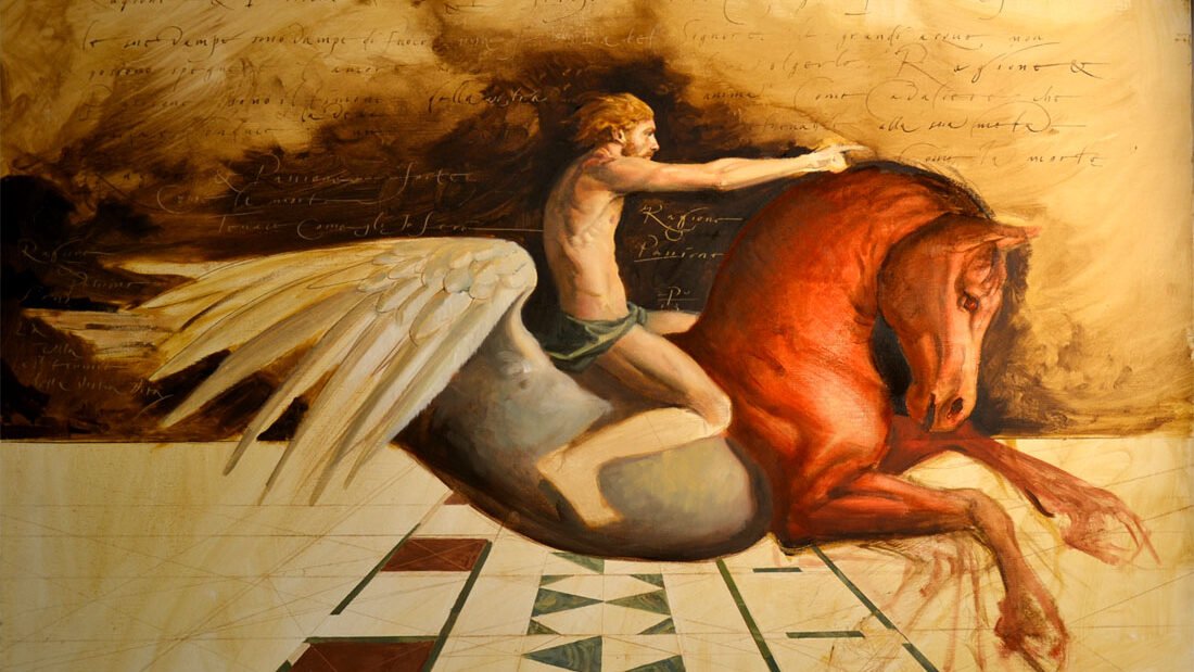 “Soggetti classici e composizioni allegoriche prendono vita attraverso una pittura colta e raffinata, frutto di una rigorosa ricerca sulle tecniche pittoriche tradizionali.”